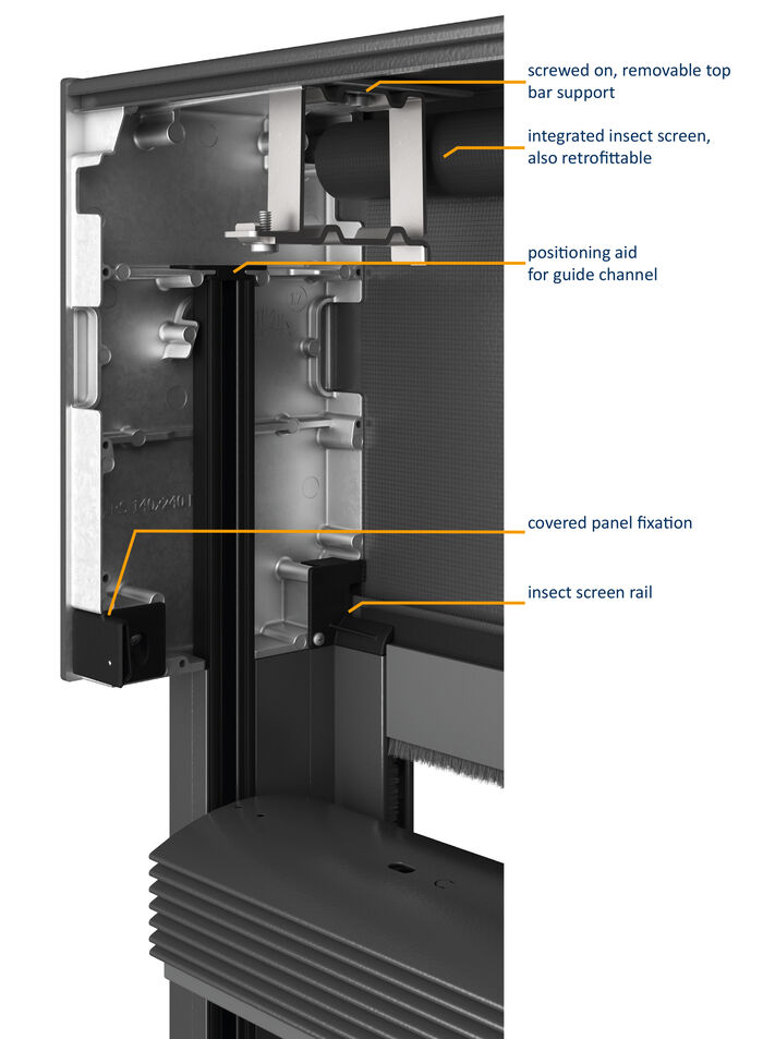 All three box sizes can also be equipped with integrated insect protection. This is placed on a spring shaft in the box behind the plate stack and is immediately ready for use if required. During the winter months, the insect protection roller blind is kept out of sight and protected in the box.