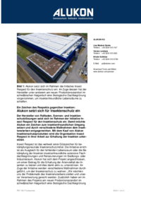 Insect Respect ist das weltweit erste Gütezeichen für bekämpfungsneutrale Insektenschutzmittel. Die Initiative errichtet als Ausgleich für den fehlenden Lebensraum oder die Bekämpfung der Insekten insektenfreundliche extensive Flachdachbegrünungen und Renaturierungen im Siedlungs- oder Industrieraum. Alukon hat sich dem Projekt angeschlossen, um einen Beitrag für die Erhaltung der Artenvielfalt der Insekten zu leisten und dies damit aktiv zu unterstützen. Im Zuge der Initiative werden verschiedene Maßnahmen durchgeführt, um den Insektenschutz zu wahren: „Wir möchten uns der Problematik des Insektensterbens stellen und unserer Verantwortung gerecht werden. Zusätzlich haben wir im Rahmen des Projekts am neuen Produktionsstandort im schwäbischen Haigerloch eine ökologische Dachbegrünung geschaffen, um einen insektenfreundlichen Lebensraum zu ermöglichen“, erklärt Alexander Winkler, Leitung Produktmanagement und Marketing bei Alukon.