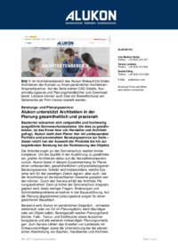 Beratend wirkt Alukon im persönlichen Gespräch – entweder telefonisch oder vor Ort im Planungsbüro, beim Bauträger oder am Objekt selbst. Bereitgestellt werden Planungshandbücher, Farb-, Textur- und Stoffmuster sowie Ausschreibungstexte und alle weiteren notwendigen Planungsunterlagen. Zum Service zählen das Erstellen von Leitdetails mit Einbauvorschlägen sowie die Unterstützung bei der planerischen Abstimmung von Bauherr, Handwerker und Architekt. Die Pläne werden ausschließlich digital erstellt. Die Handbücher decken die komplette Standardtechnik der Alukon Sonnenschutzprodukte ab.