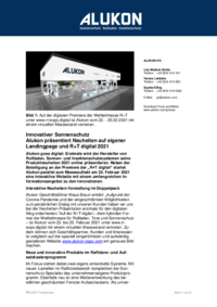 Alukon goes digital: Erstmals wird der Hersteller von Rollladen, Sonnen- und Insektenschutzsystemen seine Produktneuheiten 2021 online präsentieren. Neben der Beteiligung an der Premiere der „R+T digital“ startet Alukon parallel zum Messeauftakt am 22. Februar 2021 eine interaktive Website mit einem umfangreichen Informationsangebot zu den Innovationen.